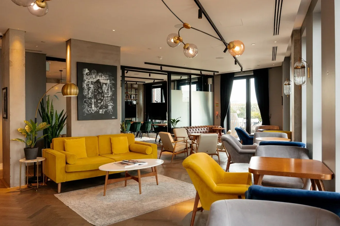 Our exquisitely designed residents’ lounge is furnished with bold coloured, mid-century furniture, and is home to art curated by Maddox Gallery and other local artists. Our residents' area also has a self-pouring wine stage, dining tables, a private meeting room, lounge and outdoor terrace with views of East London. Exclusively for the use of our aparthotel guests for co-working and relaxing, this comfortable lounge provides a social hub our guests can enjoy.